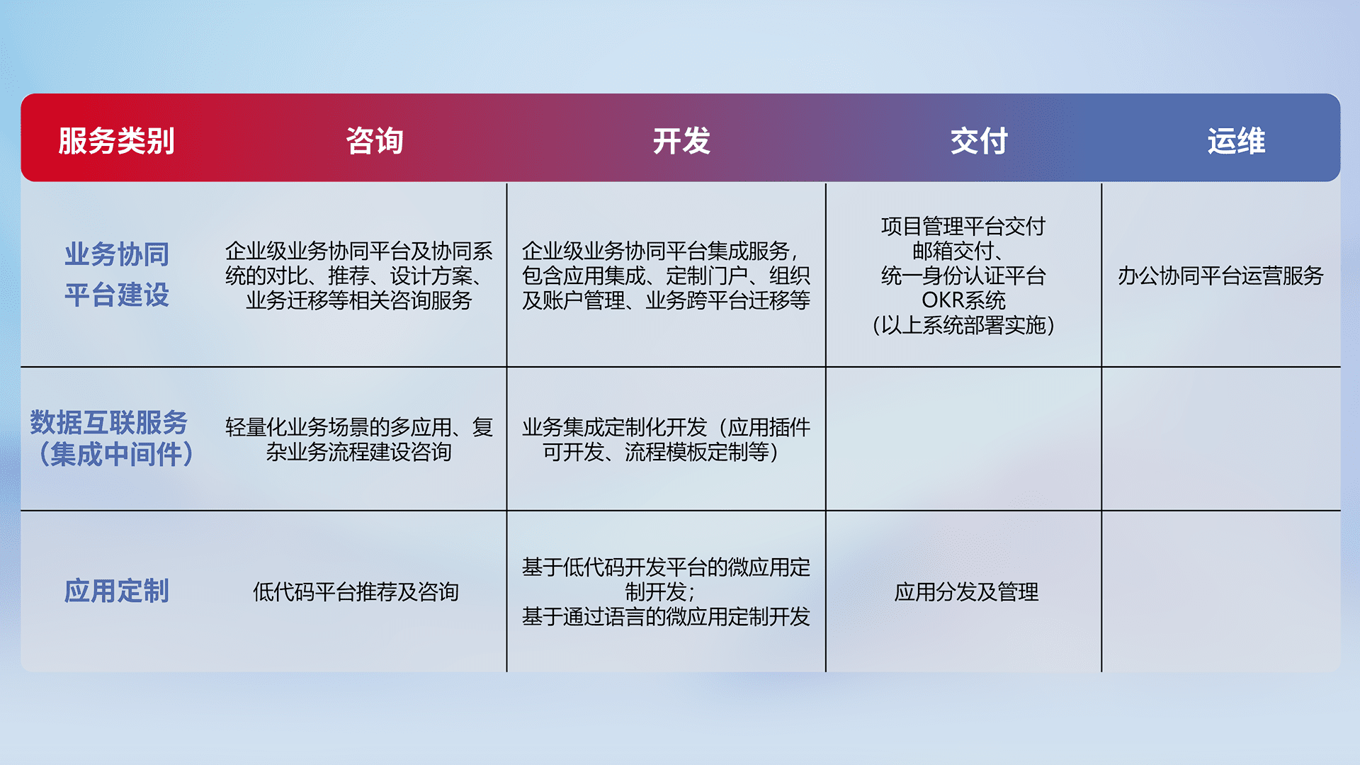 针对钉钉、、企微、、、、IDaas等平台级产品提供产品的规划、、、、方案、、交付、、、、定制化开发等服务,,实现如统一协同办公、、、智能客户服务、、混合会议管理、、、、智能数据查询、、、、等业务场景,,,实现数字化转型。。