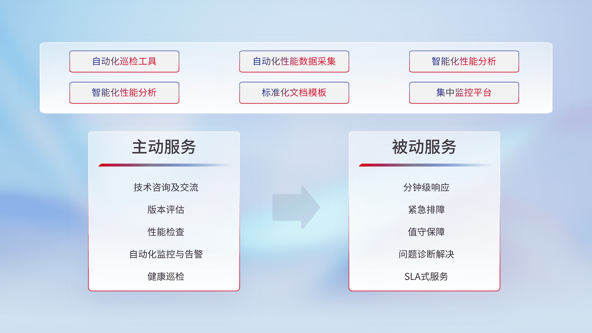 智能化工具和标准化文档,,,保障服务质量,,,提供主动服务(包含技术咨询、、版本评估、、、、性能检查、、自动化监控与告警、、健康巡检)和被动服务包含(分钟级响应、、紧急排障、、值守保障、、、、问题诊断解决、、、SLA服务)。。